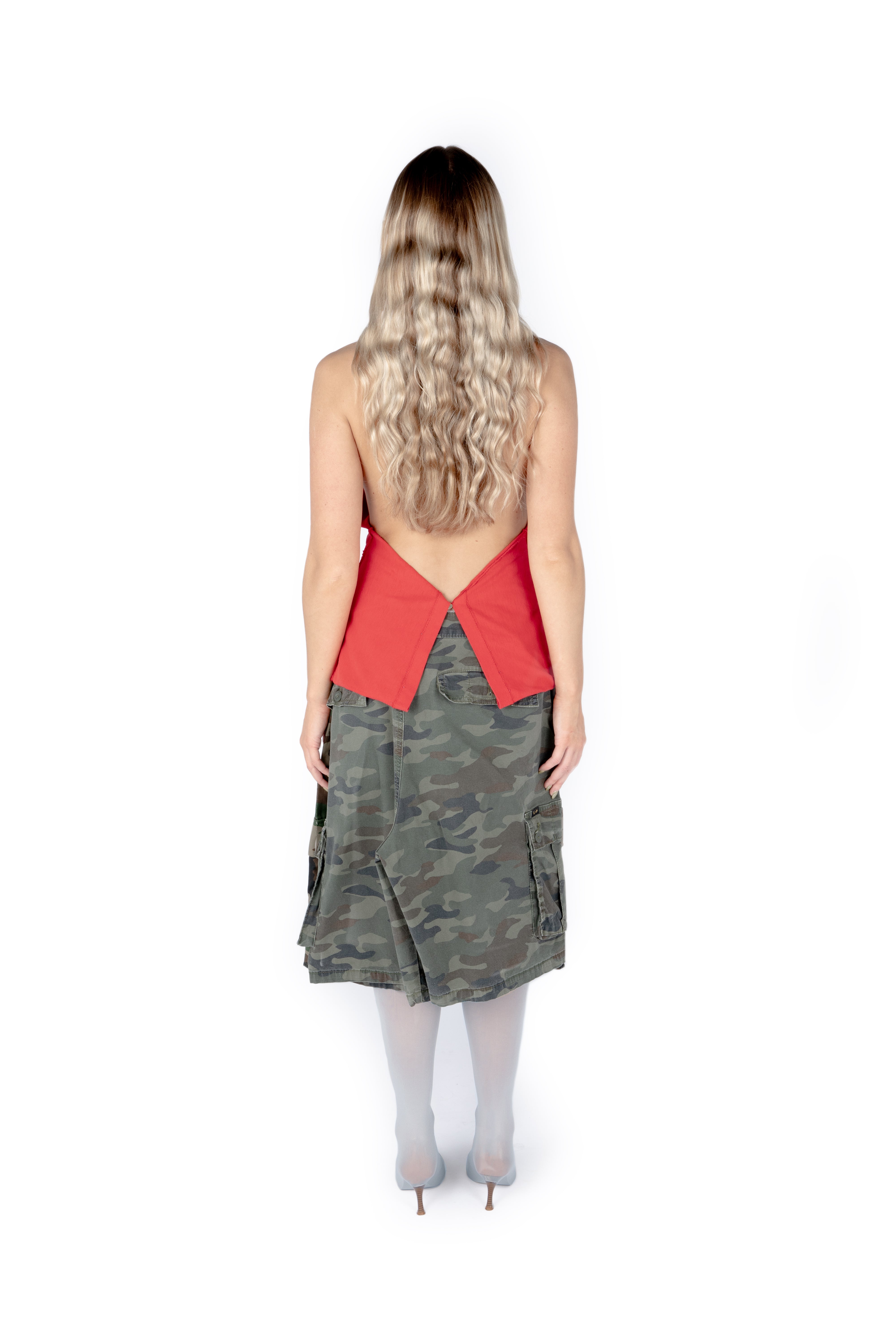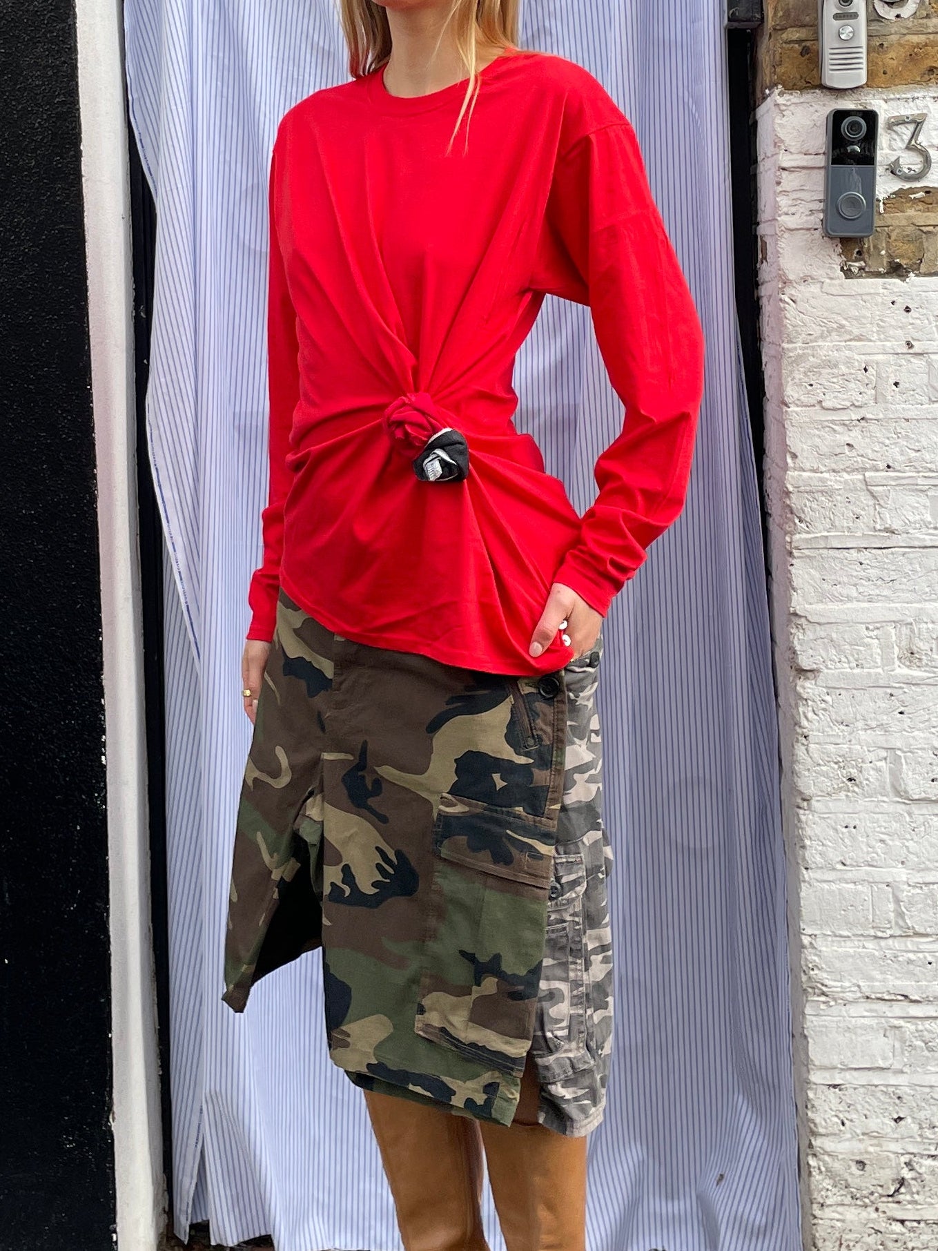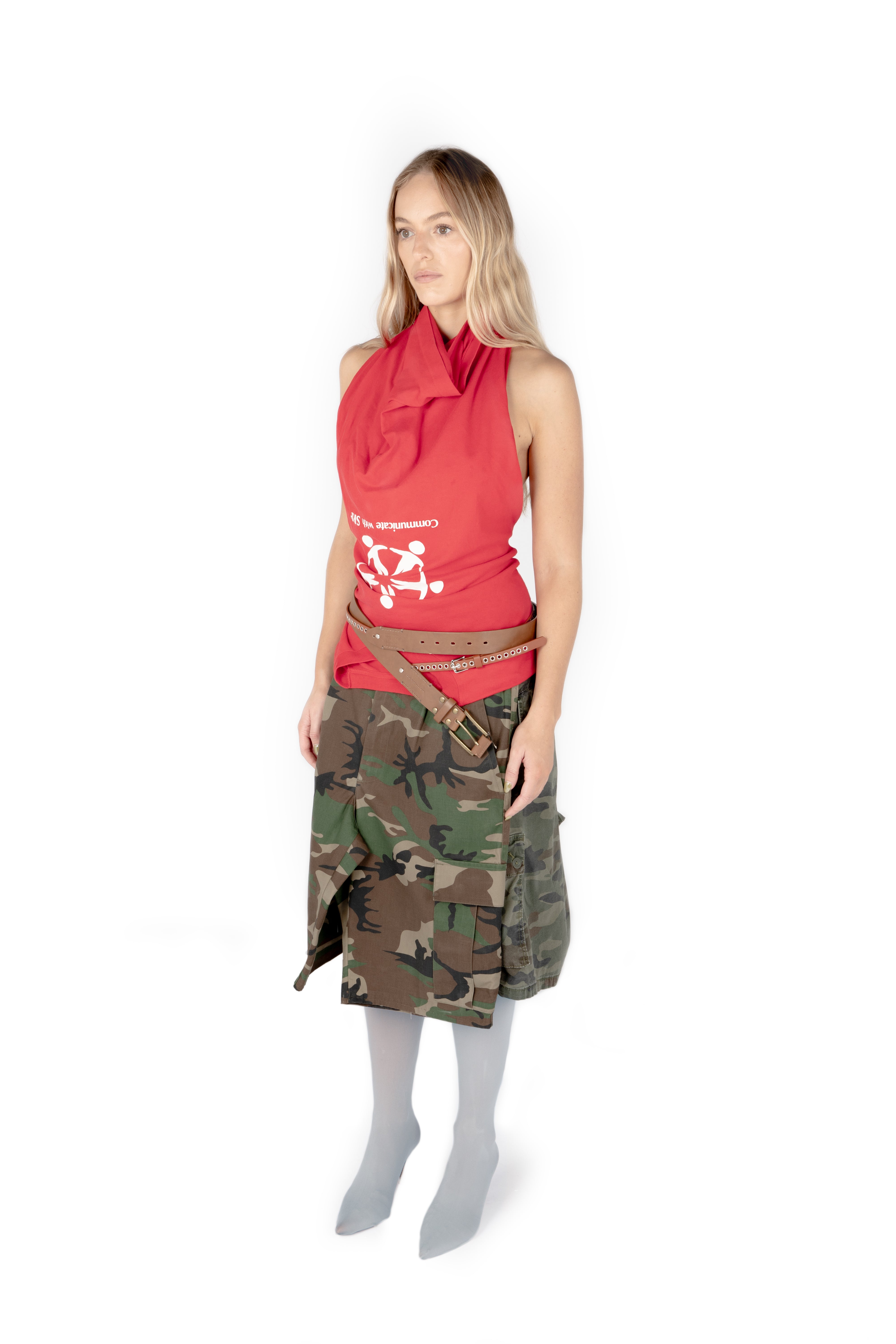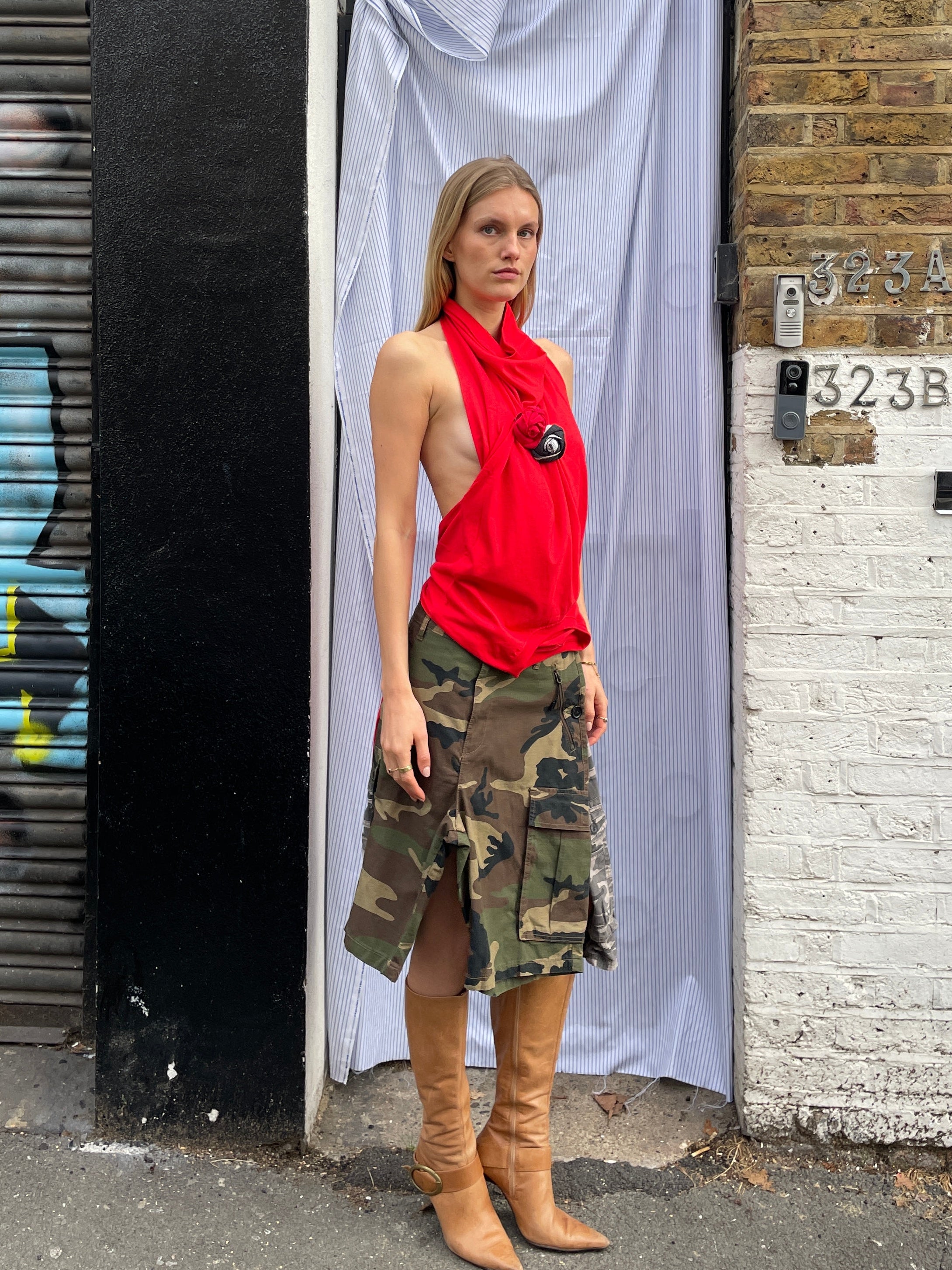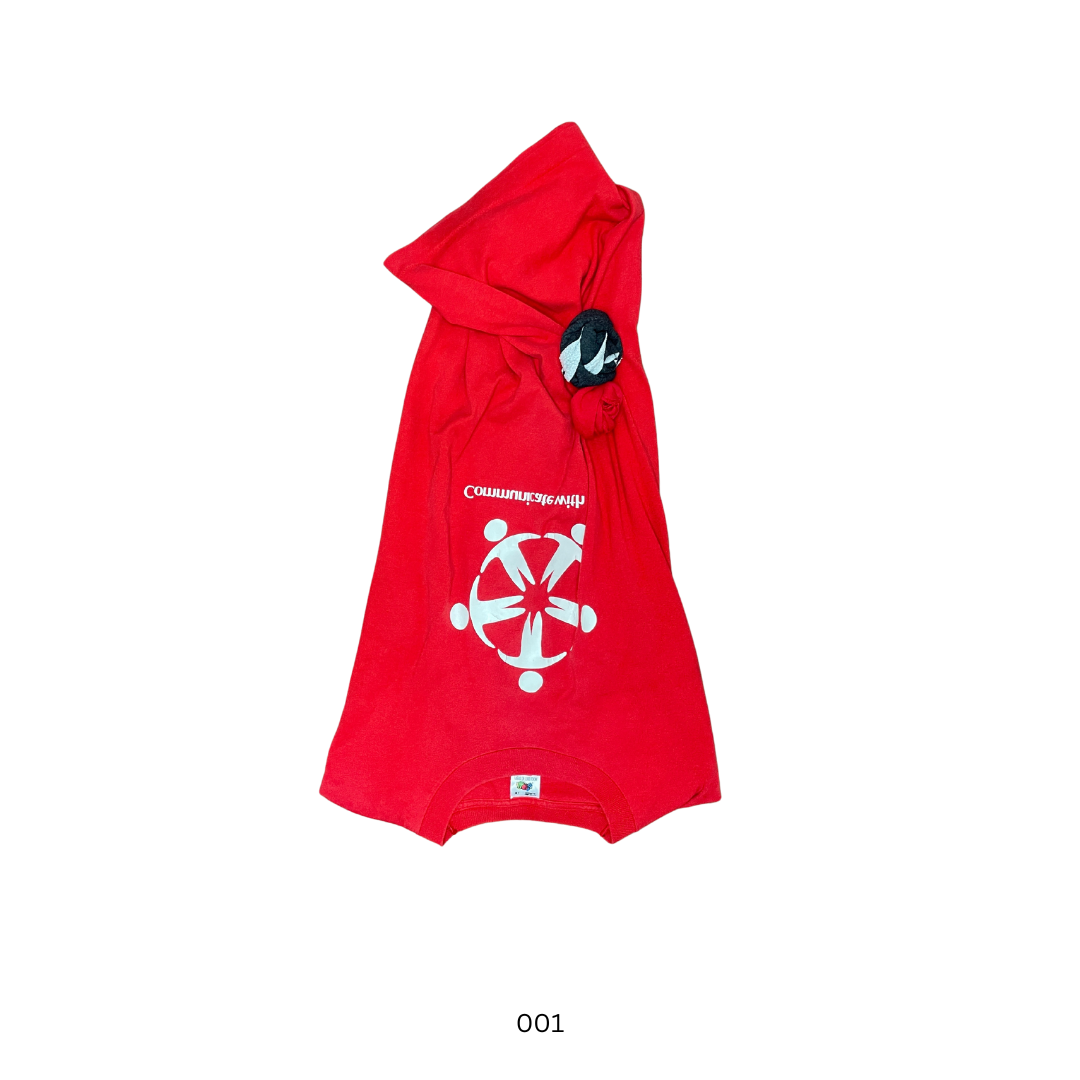 FLIPPED TSHIRT with handmade rose pin. Halter neck top with cowl neck, fixed at the back with shell buttons and dainty handmade button loops. Flip it back to wear as a standard tee. Each tee comes with a removable roses pin, made by hand from damaged tees. Use the pin to ruche fabric how you wish.