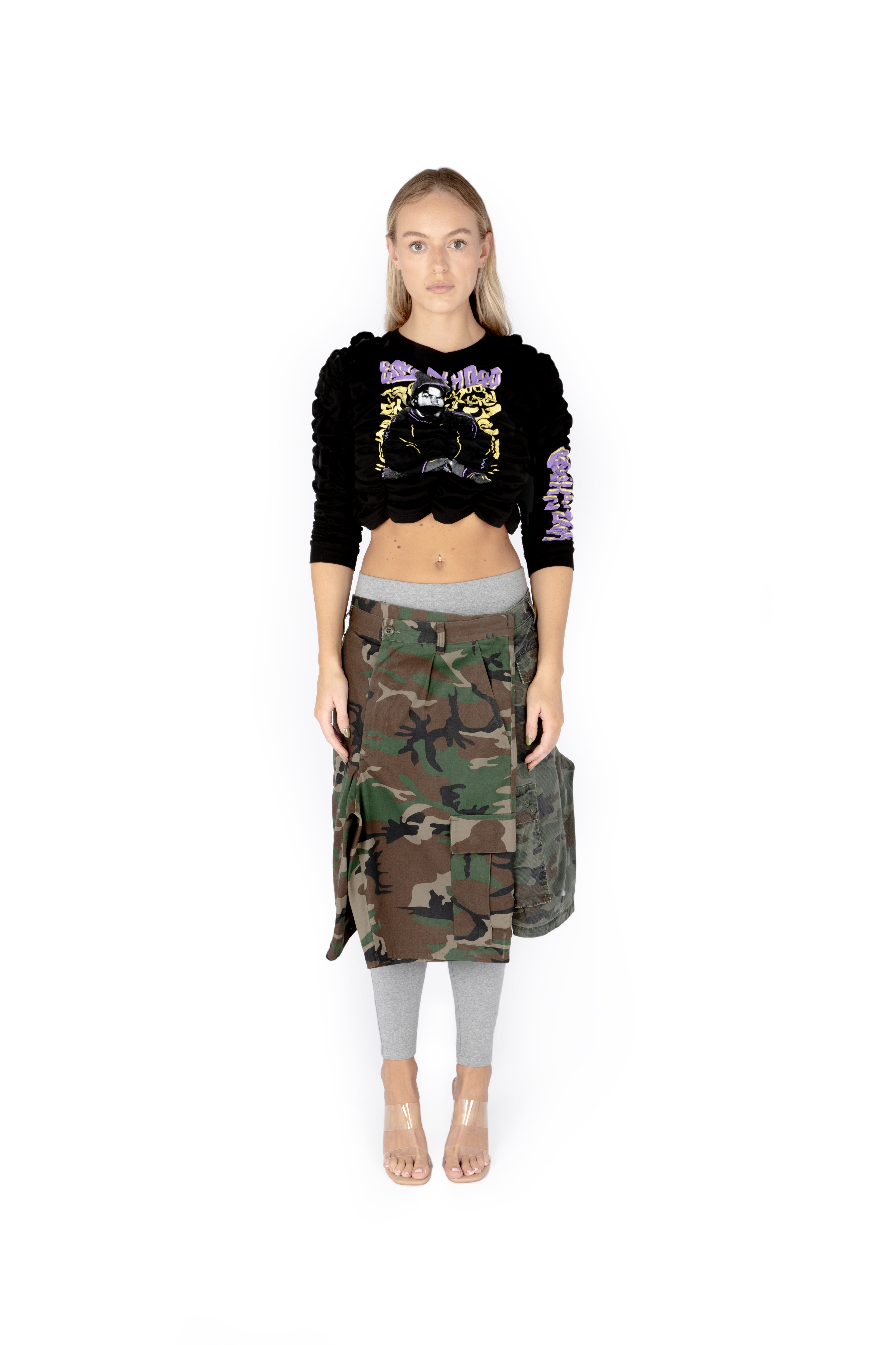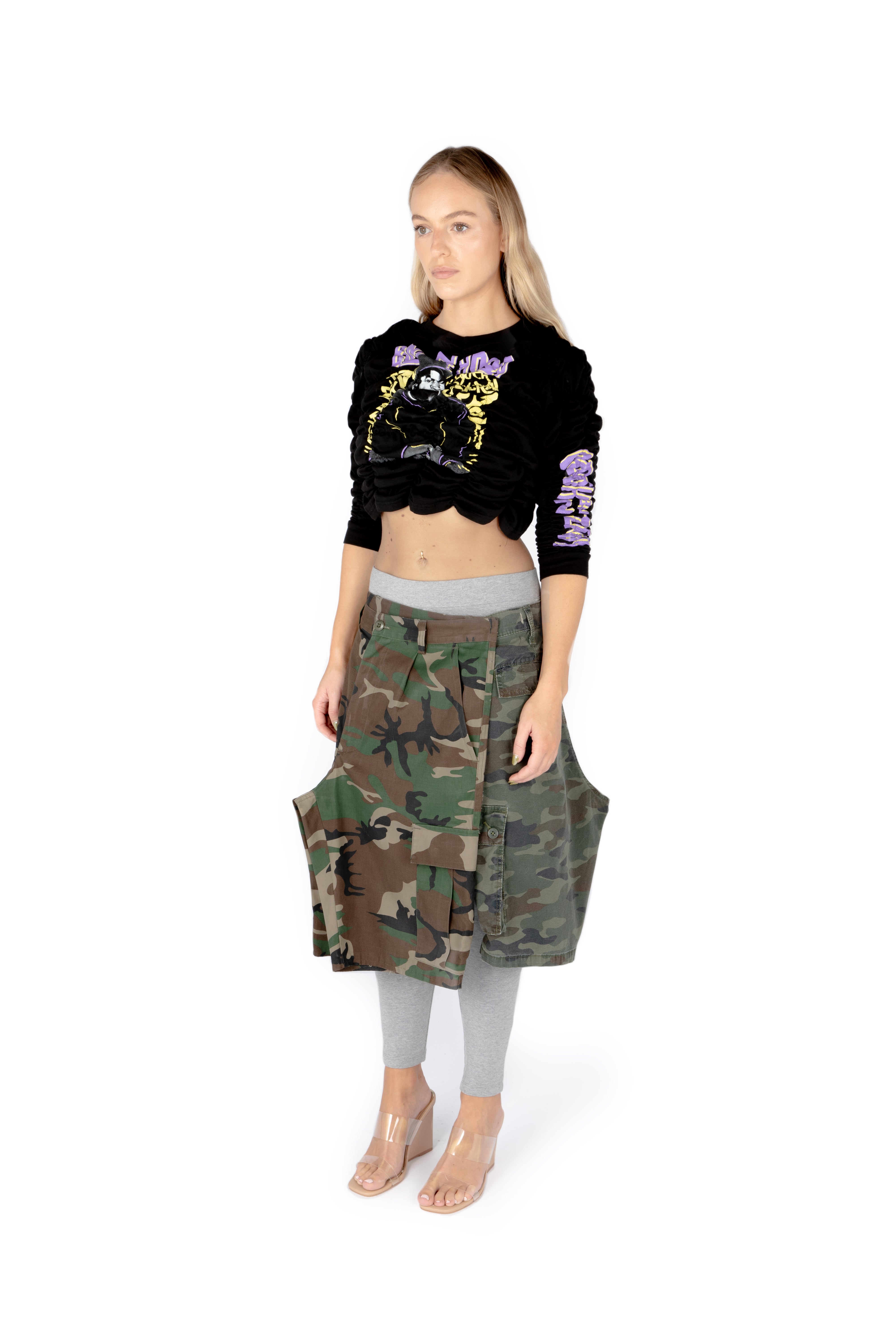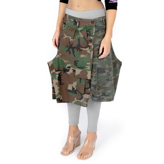 WRAP SKIRT in multiple camo prints. This style has the appearance of two mens camo shorts, wrapping around the body. Buttons / poppers fasten the skirt at the hips.